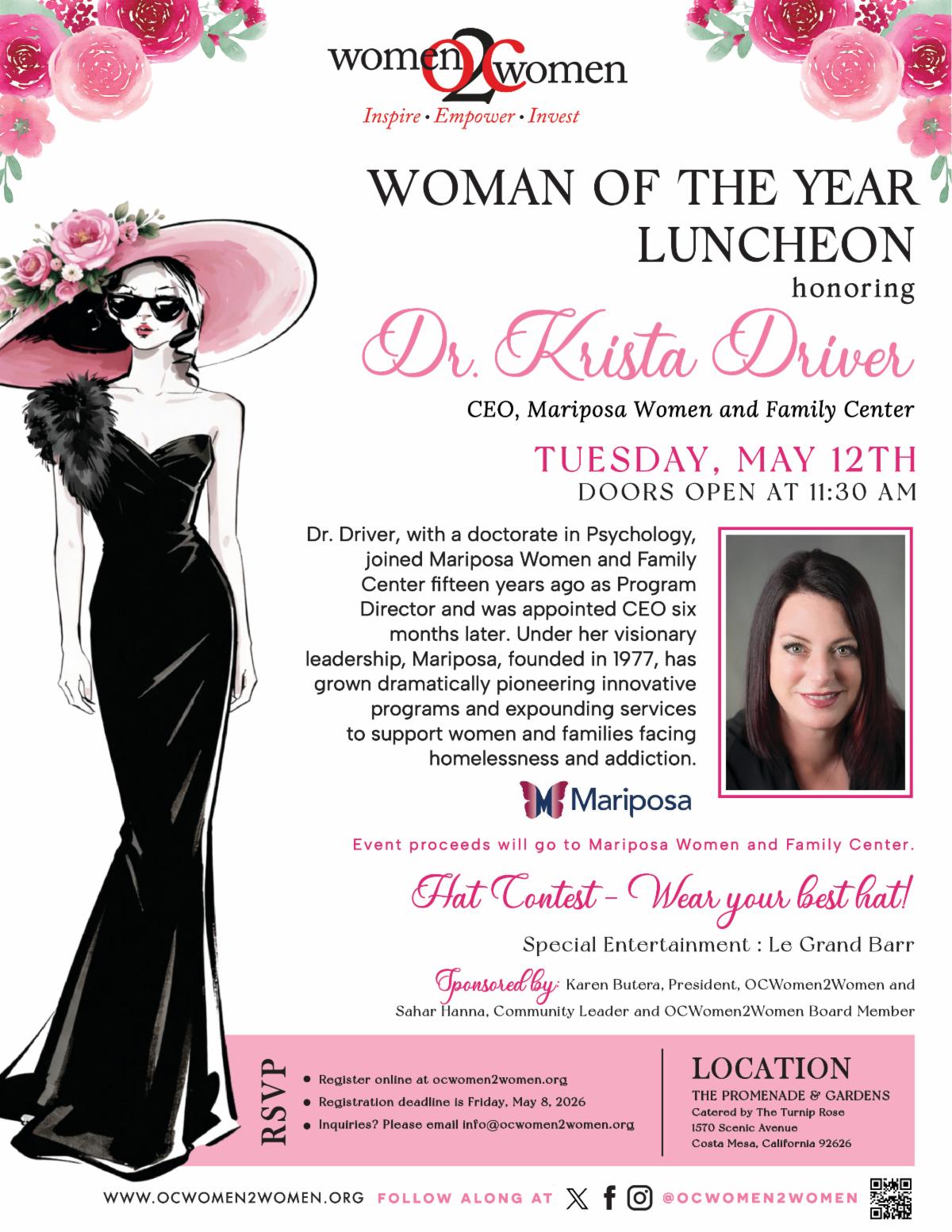 OC Women2Women’s Annual Woman of the Year Luncheon, being held Tuesday, May 12th, is a special event that honors leadership, service, and the women who are making a real difference in Orange County. Every year, we gather to honor an exceptional woman whose work shows how inspiring, empowering, and supporting others can make a real impact.